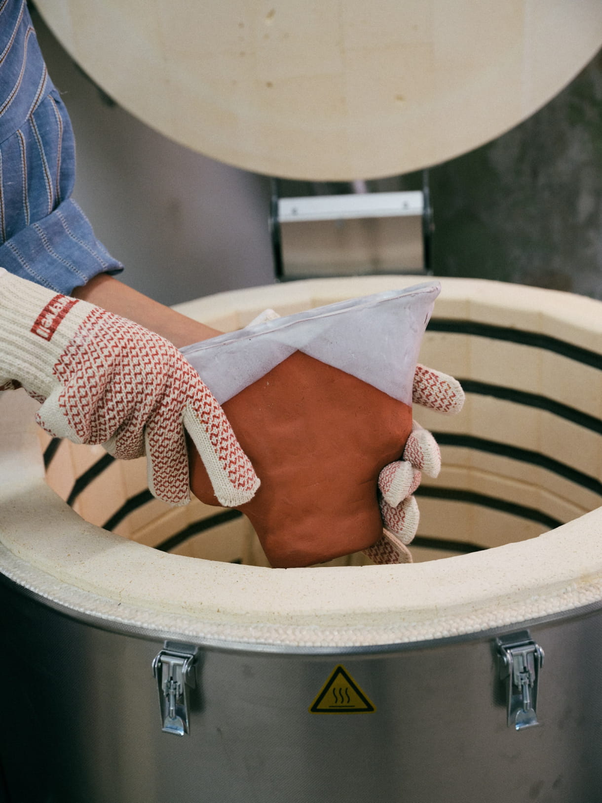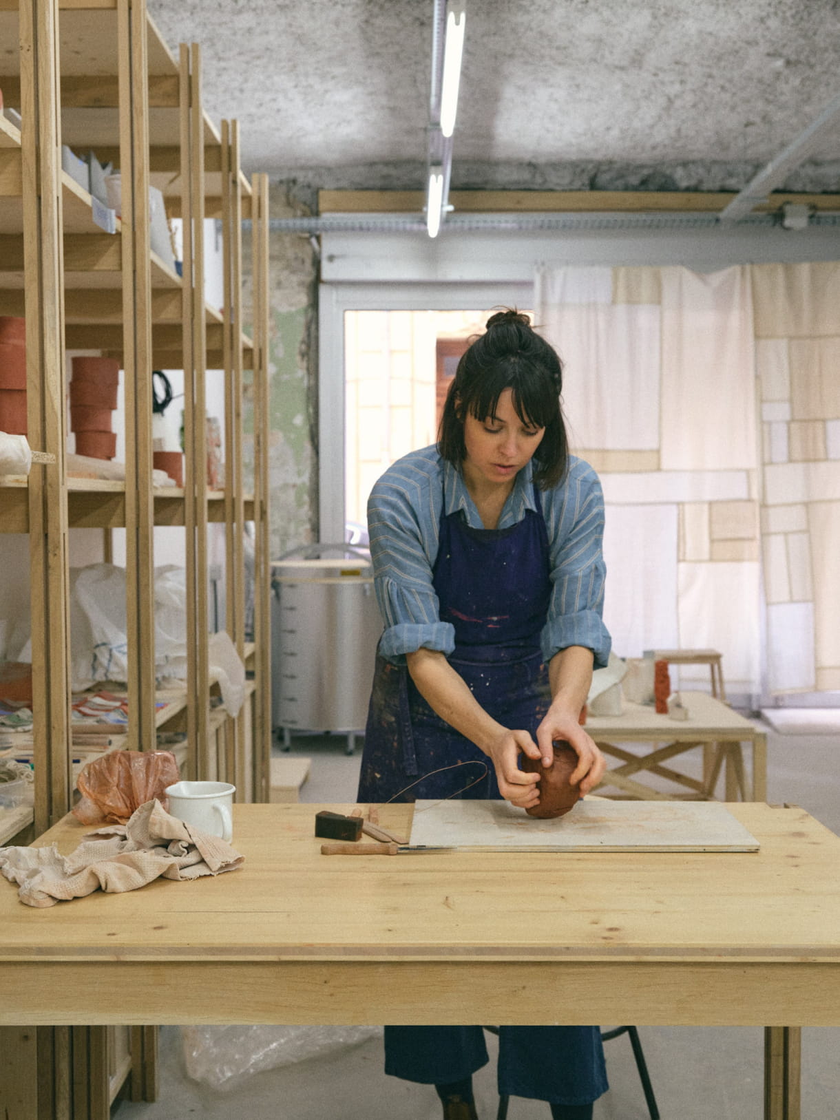 When I enter the workshop. I look at the pieces in progress, often in the drying phase; then I take out my loudspeaker, I start the music, I put on my workshop clothes, adequate shoes and I slip on my work apron. Then I select the tools I need for the session and get started.