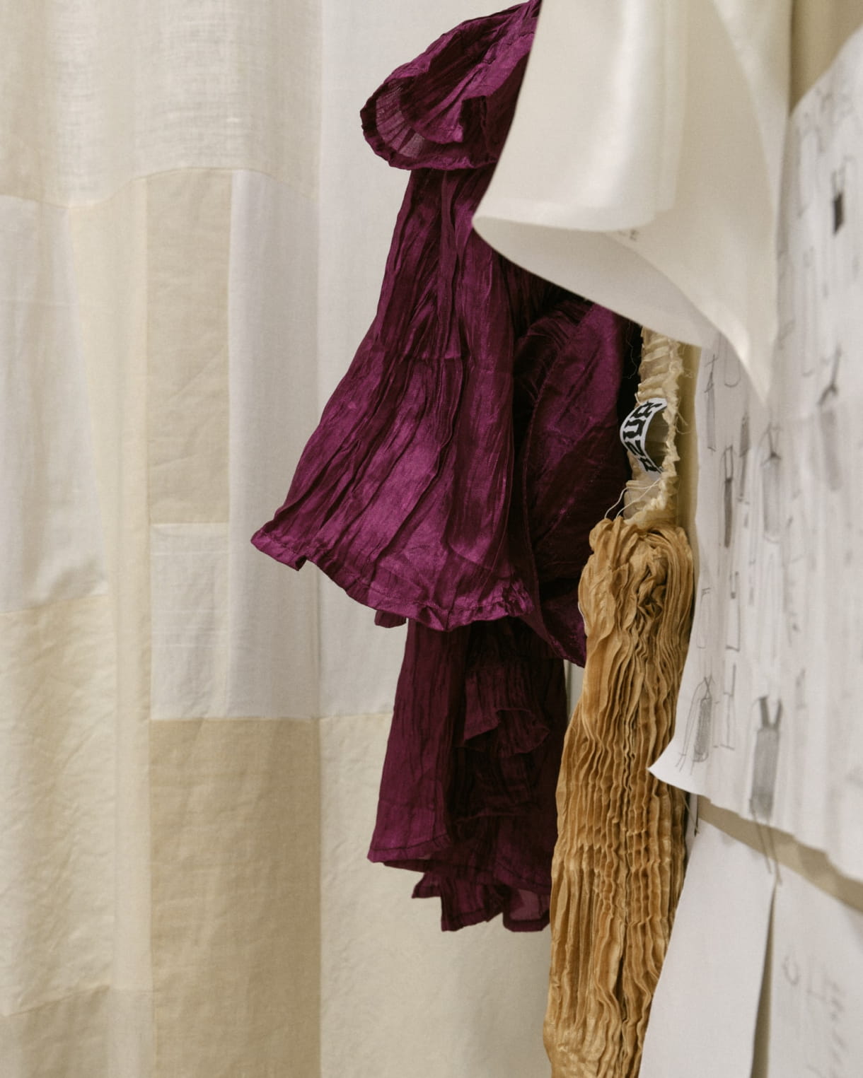 For our next collection, which will be released in the spring, we have continued exploring pleated silk and natural dye. We have also developed a summer palette in shades of beige, pink and red, and we can't wait to reveal it.
