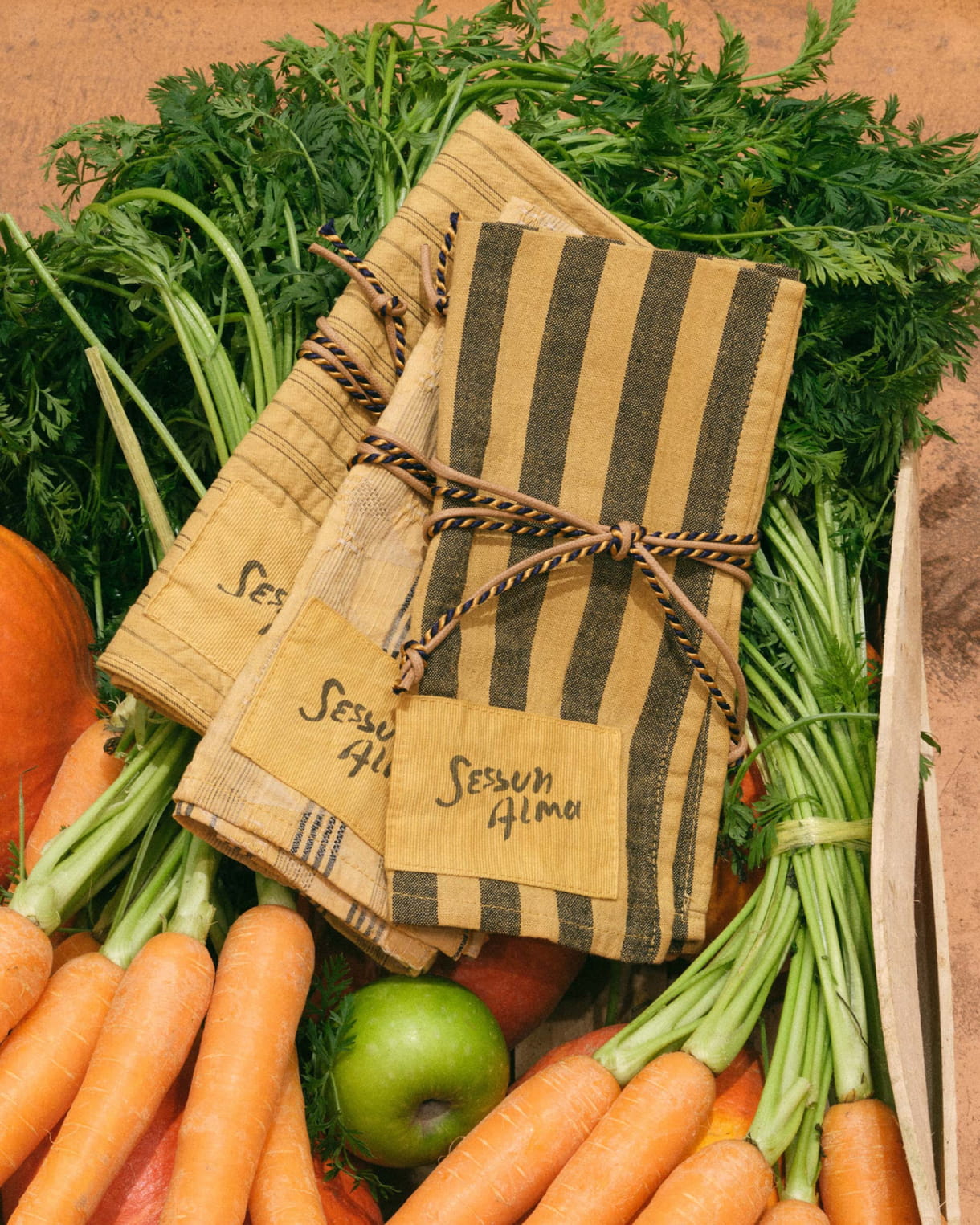 We met the Sessùn style team a year ago. They contacted us with the aim of doing vegetable dyeing end-of-stock fabrics to create upcycled household linen.