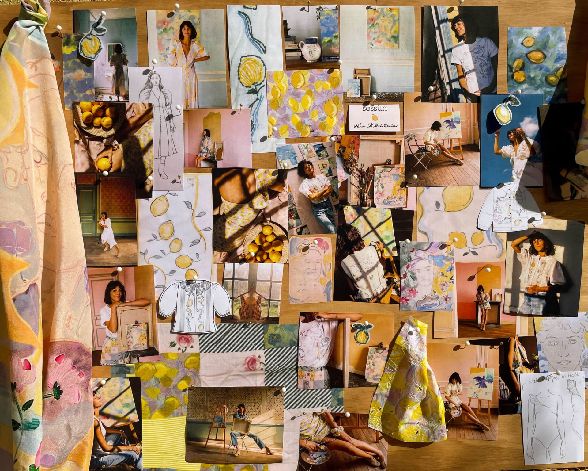 Every meeting with Emma and the Sessùn team in general felt effortless, illuminating, and joyful. Together, we discovered ideas for inspiration, shapes, and symbolic pieces of who I am and what Sessùn is. We saw this capsule as a bridge between our two worlds. I then painted patterns and prints to dress the models.