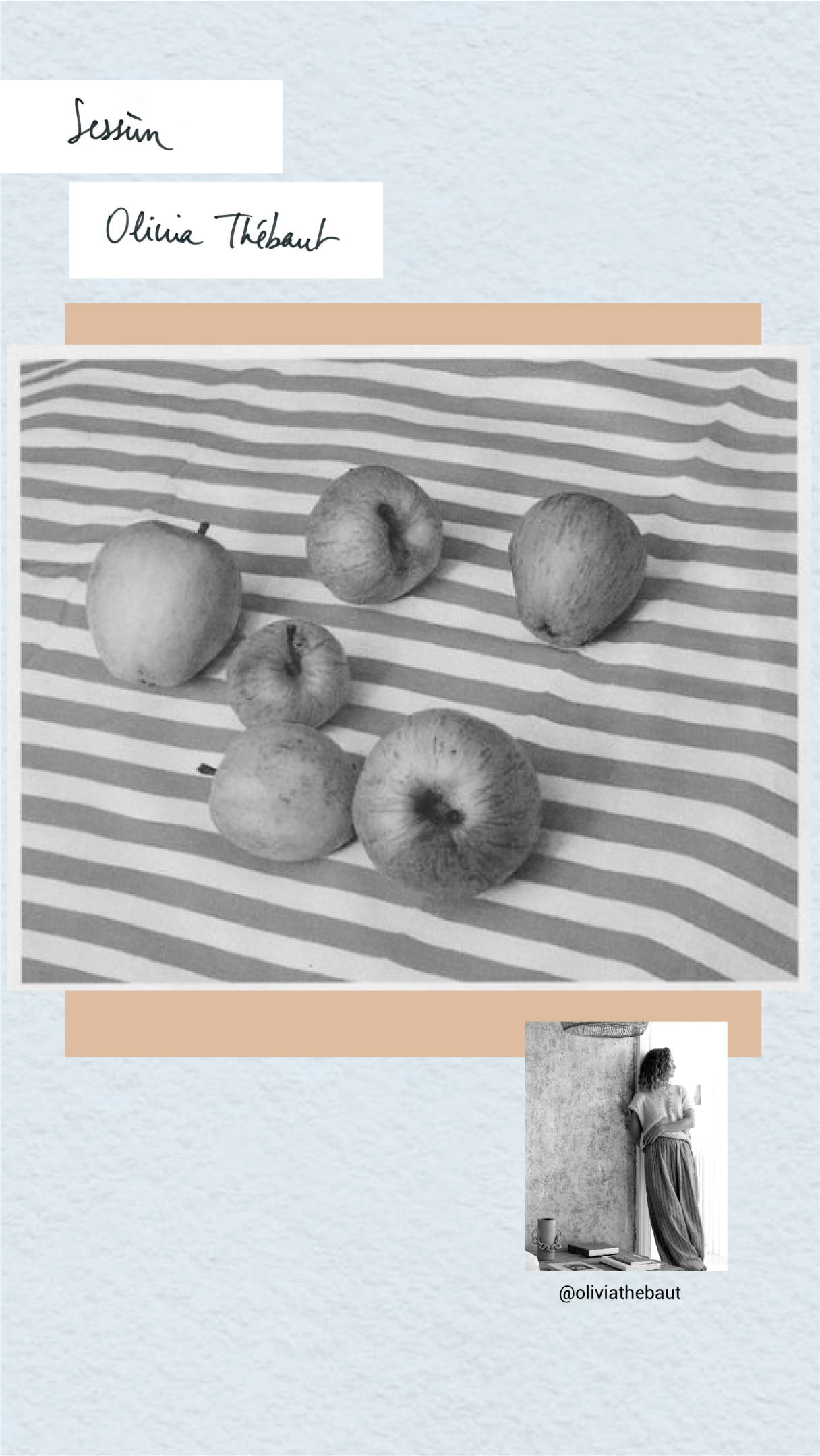 " Red apples on yellow stripes" by Delphine Chanet. A minimalist black-and-white snapshot that reflects the softness and warmth of all her work.