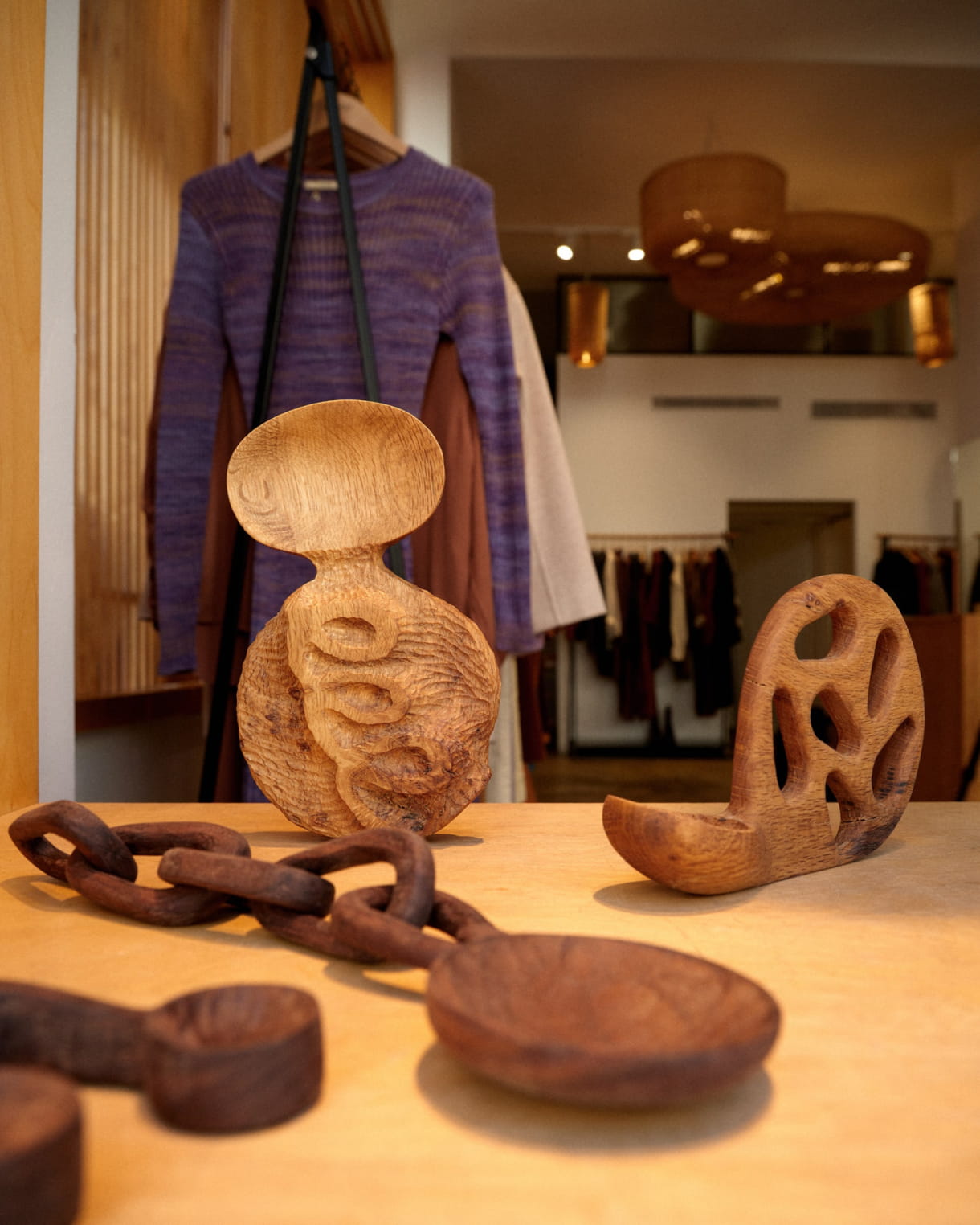 A cocoon, designed by the Jean-Brieuc workshop and made up of several hundred pieces of beech wood cut out and organised like a jigsaw puzzle, houses a selection of objects and accessories. It was in this cocoon that the exhibition was presented from 7 to 16 September 2023.