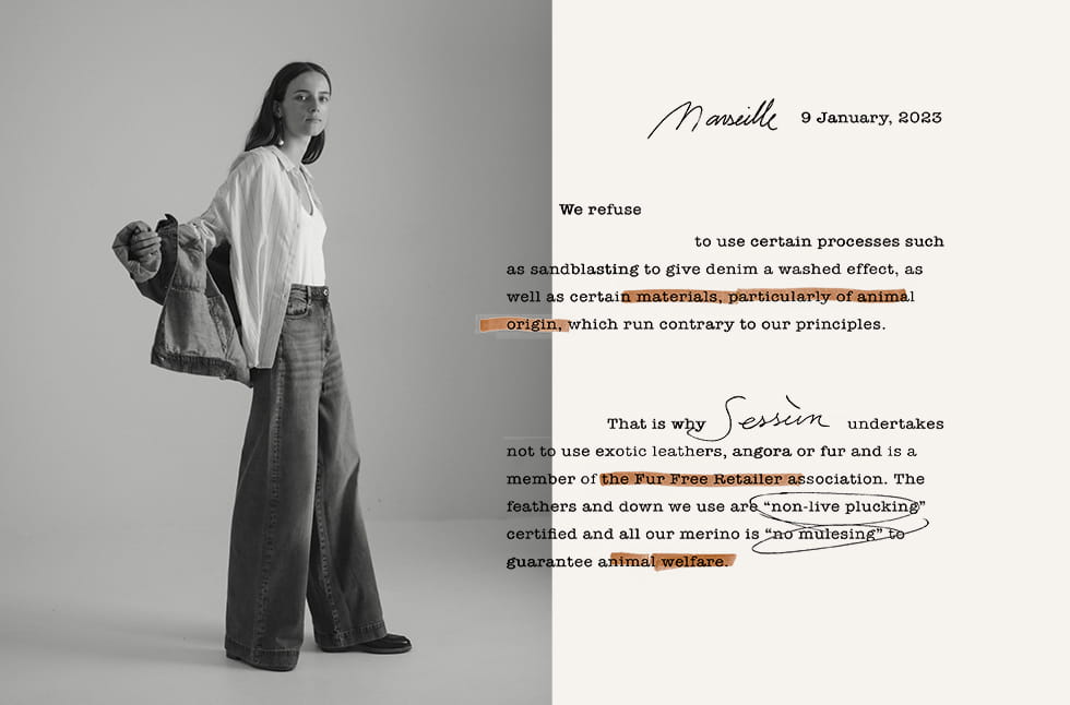 Materials are part of our history, our DNA. They are often what give birth to an idea, a model, a story. They tell the story of our know-how, our love of the garment... and its durability. That's why we choose them with the utmost care, while constantly questioning the impact of our choices. Several years ago, we decided to fully commit to transitioning to more responsible, less polluting fibers, produced under conditions that are more environmentally friendly and respectful towards people. We refer to them as lower impact materials. In our collection, we achieved 64% of lower impact materials.
